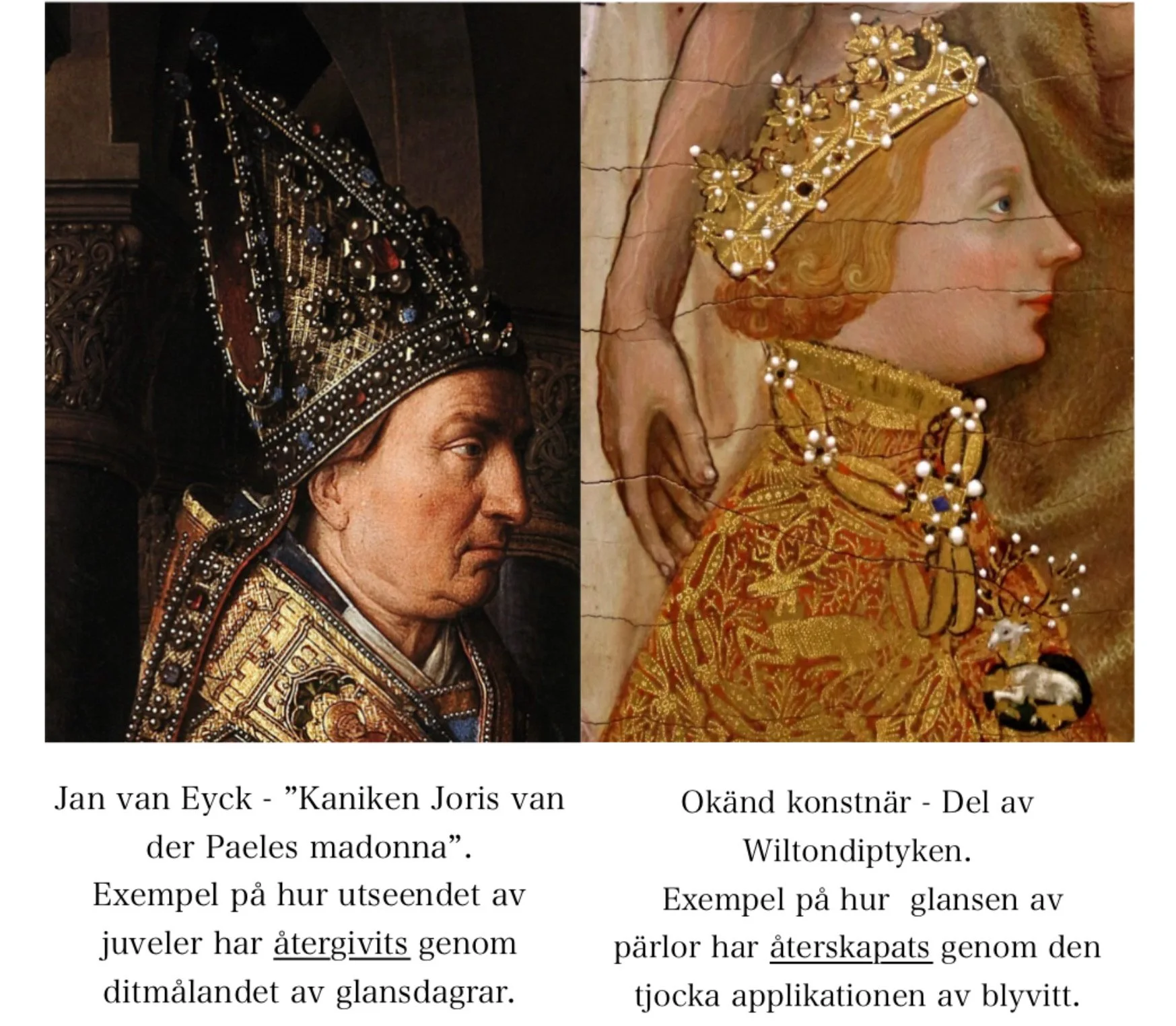 Under medeltiden framställde konstnärer materialverkan av glans och genomskinlighet genom att faktiskt i bilden återskapa motsvarande materiella villkor, snarare än att enbart med färgstoff återge dess sken. Exempelvis kunde ett genomskinligt och starkt reflekterande material som diamant målas i flera skikt där de först lade på ett lager bladguld som de senare färgade med transparenta lasurer. Sedan antiken är Jan van Eyck först med att åter avbilda det faktiska utseendet av glänsande material, och denna förtjänst kan närmast tillskrivas hans introducerande av den länge bortglömda glansdagern. Det verkar nästan som att det rådande bildspråket under medeltiden ännu inte hade lokaliserat vari den optiska egenskapen av glans bestod och därför inte heller formulerat ett sätt att förmedla denna materialegenskap rent bildmässigt.